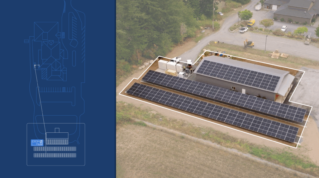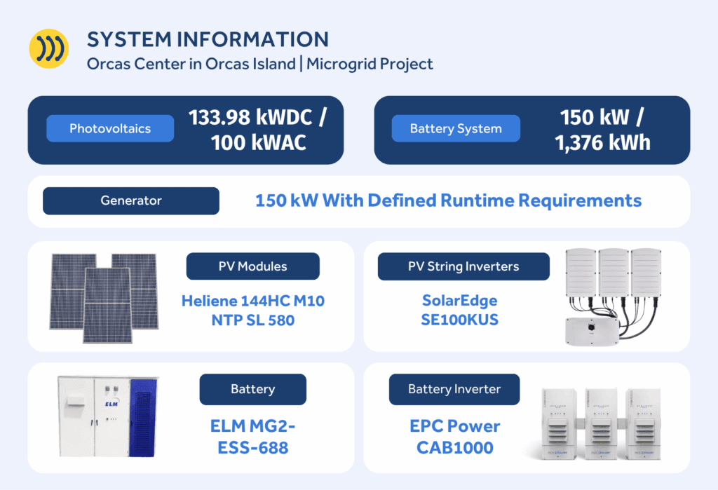 Based in Bellingham, Washington and with a history of Pacific Northwest community-led microgrid development, Cascadia Renewables was selected as the EPC for the Orcas Center project. Cascadia worked with local partners from MZ Solar Consulting to perform preliminary analyses and Mayfield Renewables to lead planset development and to act as the electrical engineer of record.
